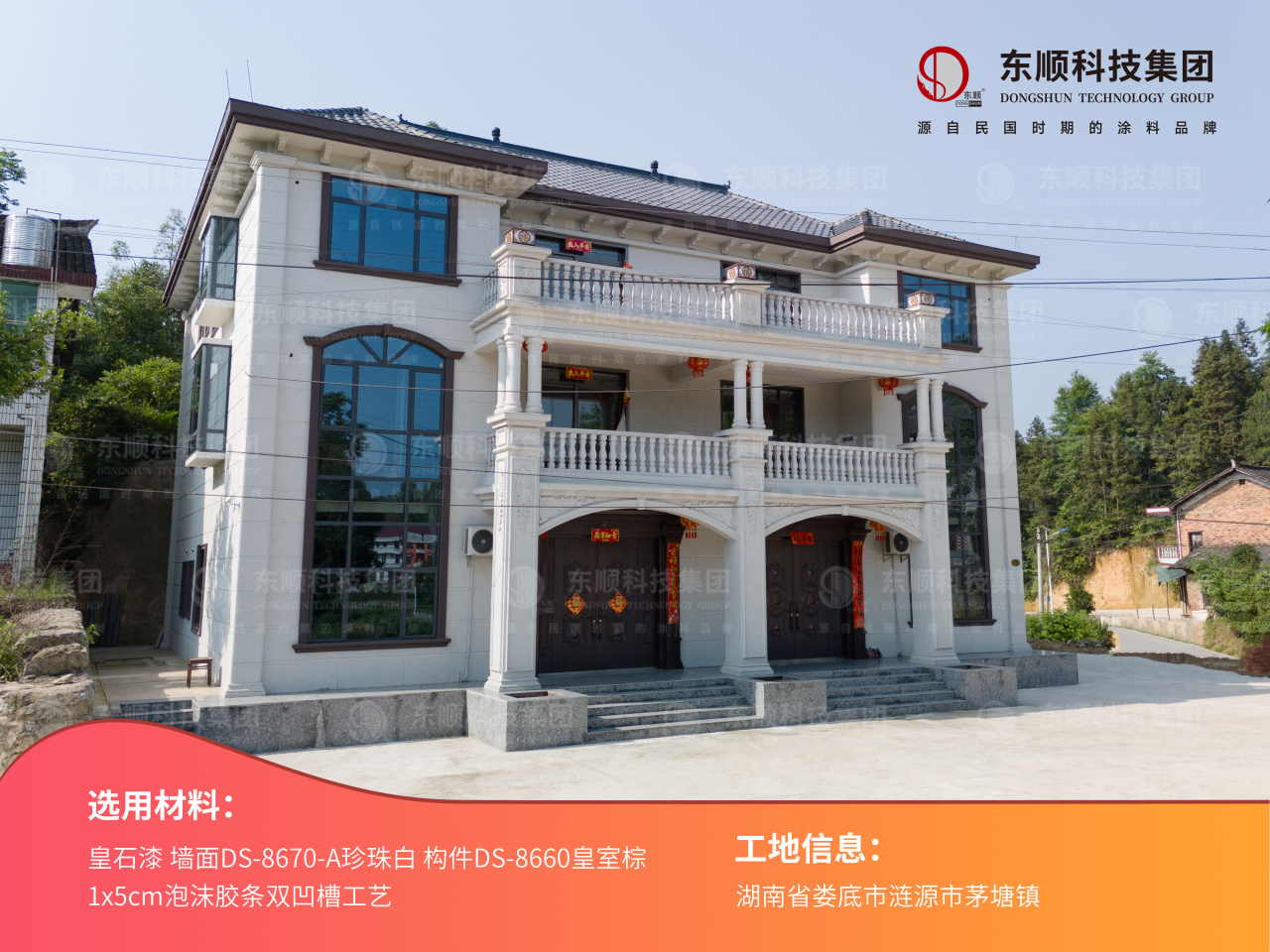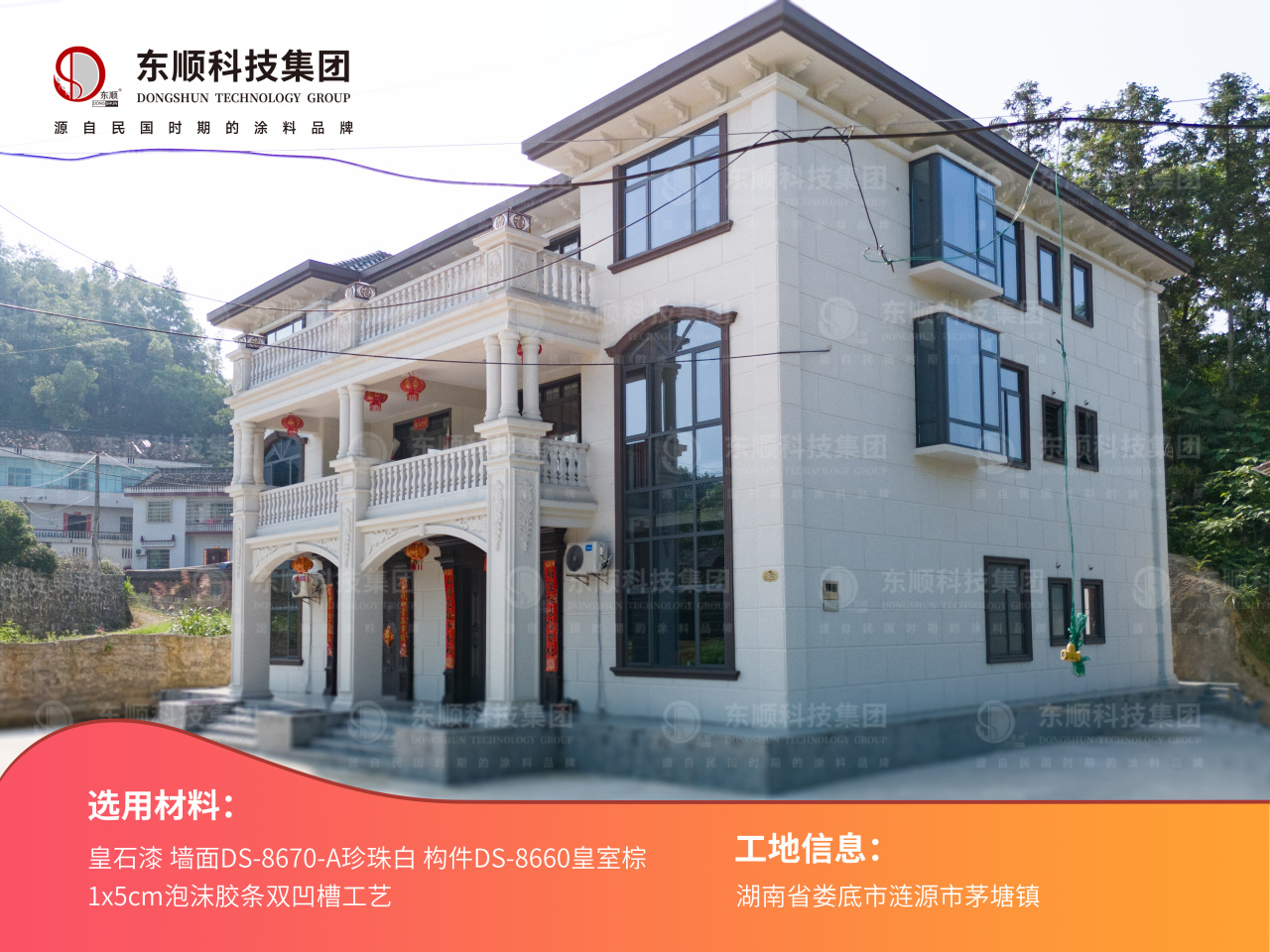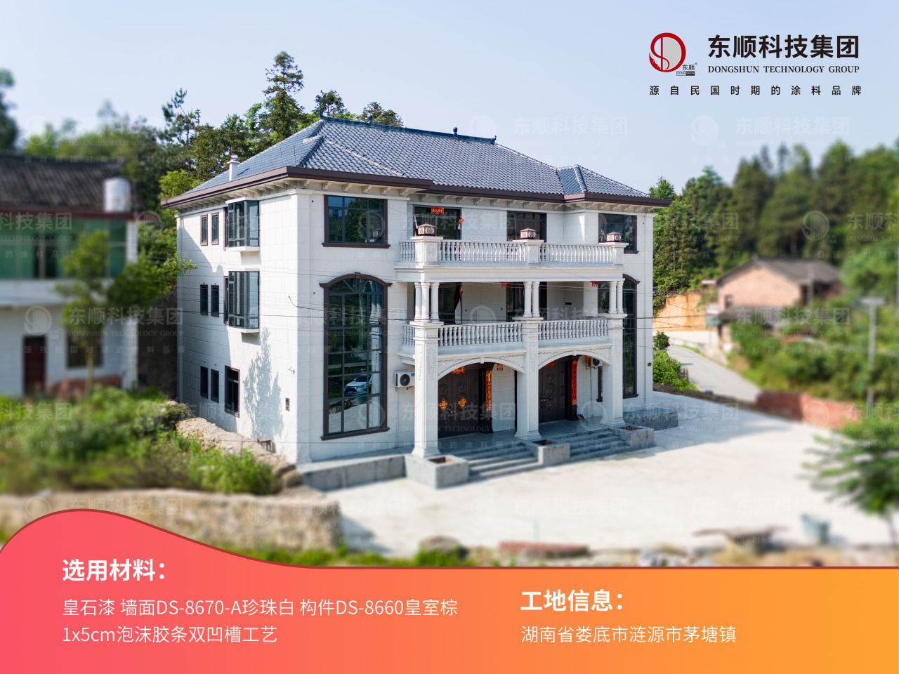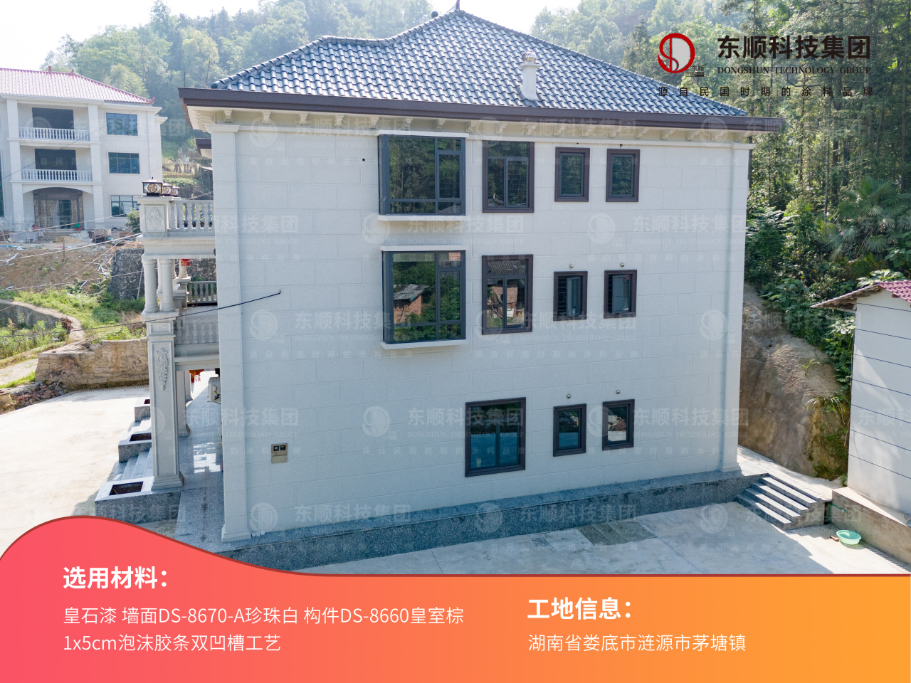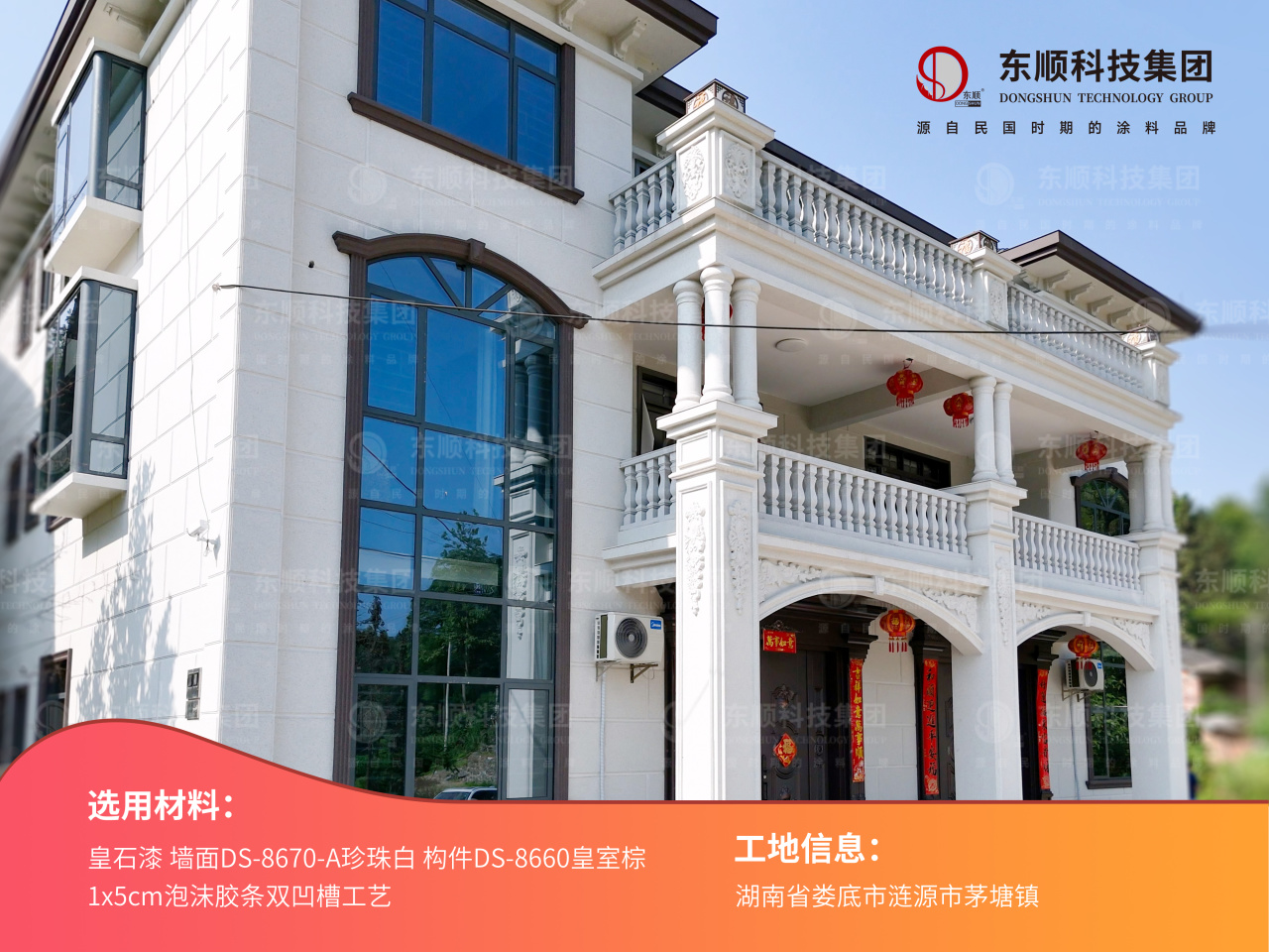 湖南省娄底市涟源市茅塘镇 皇石漆别墅案例 色号:墙面 DS-8670-A珍珠白 构件 DS-8660 皇室棕 泡沫胶条双凹槽工艺