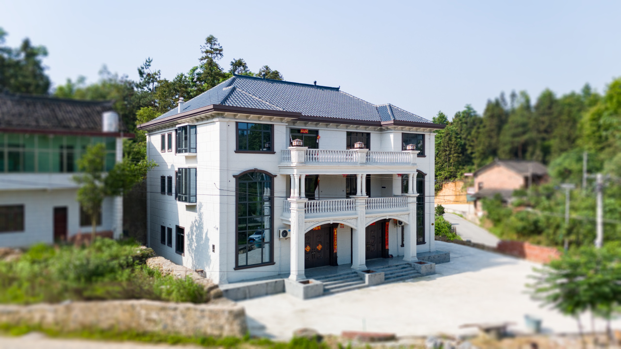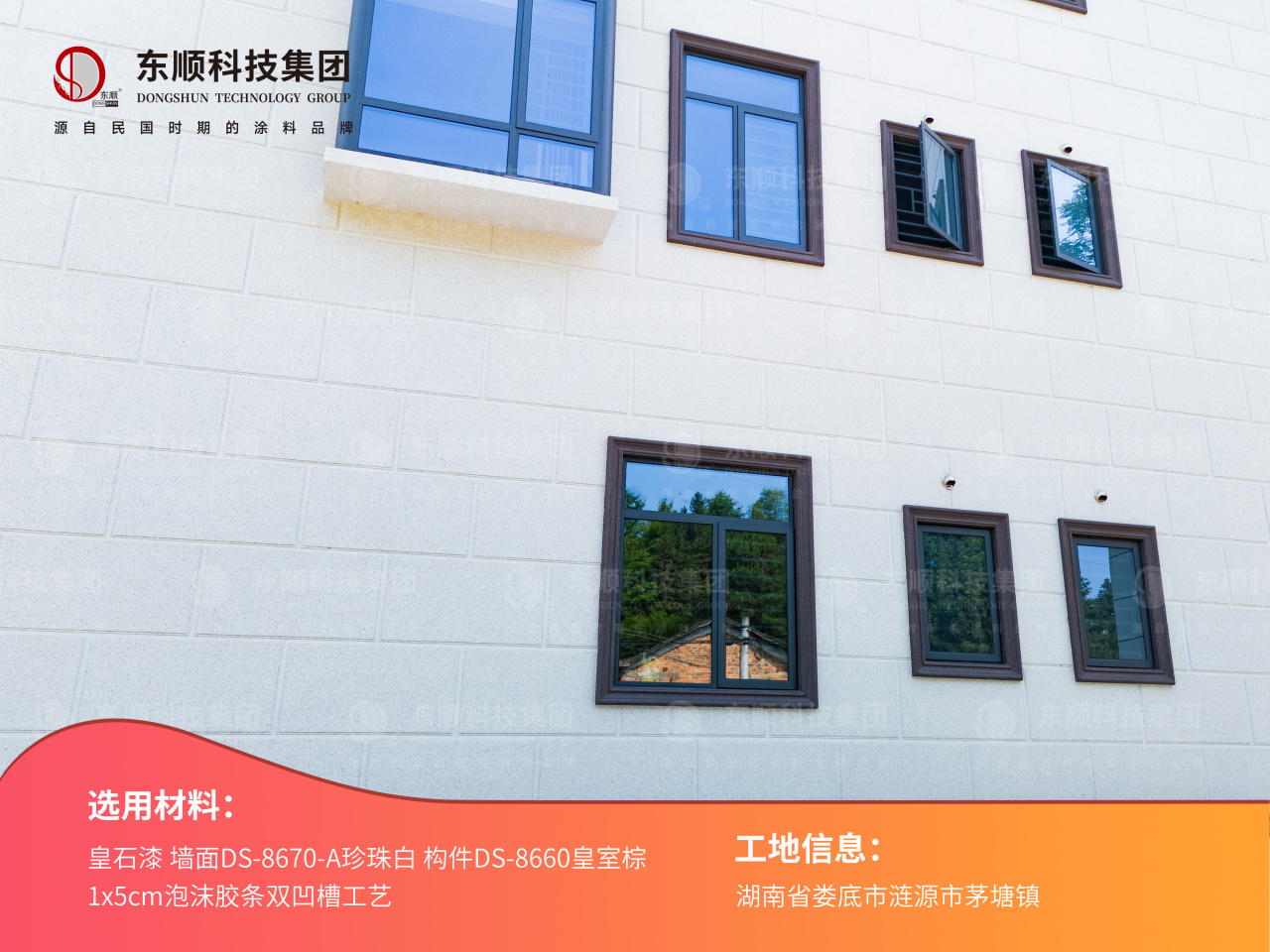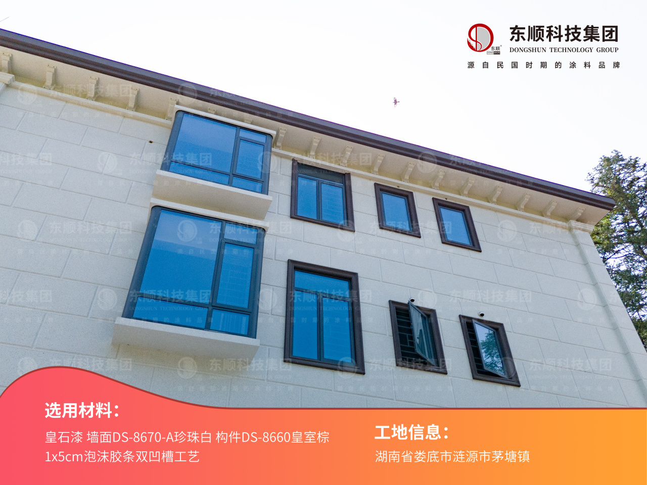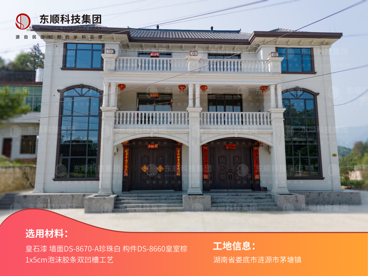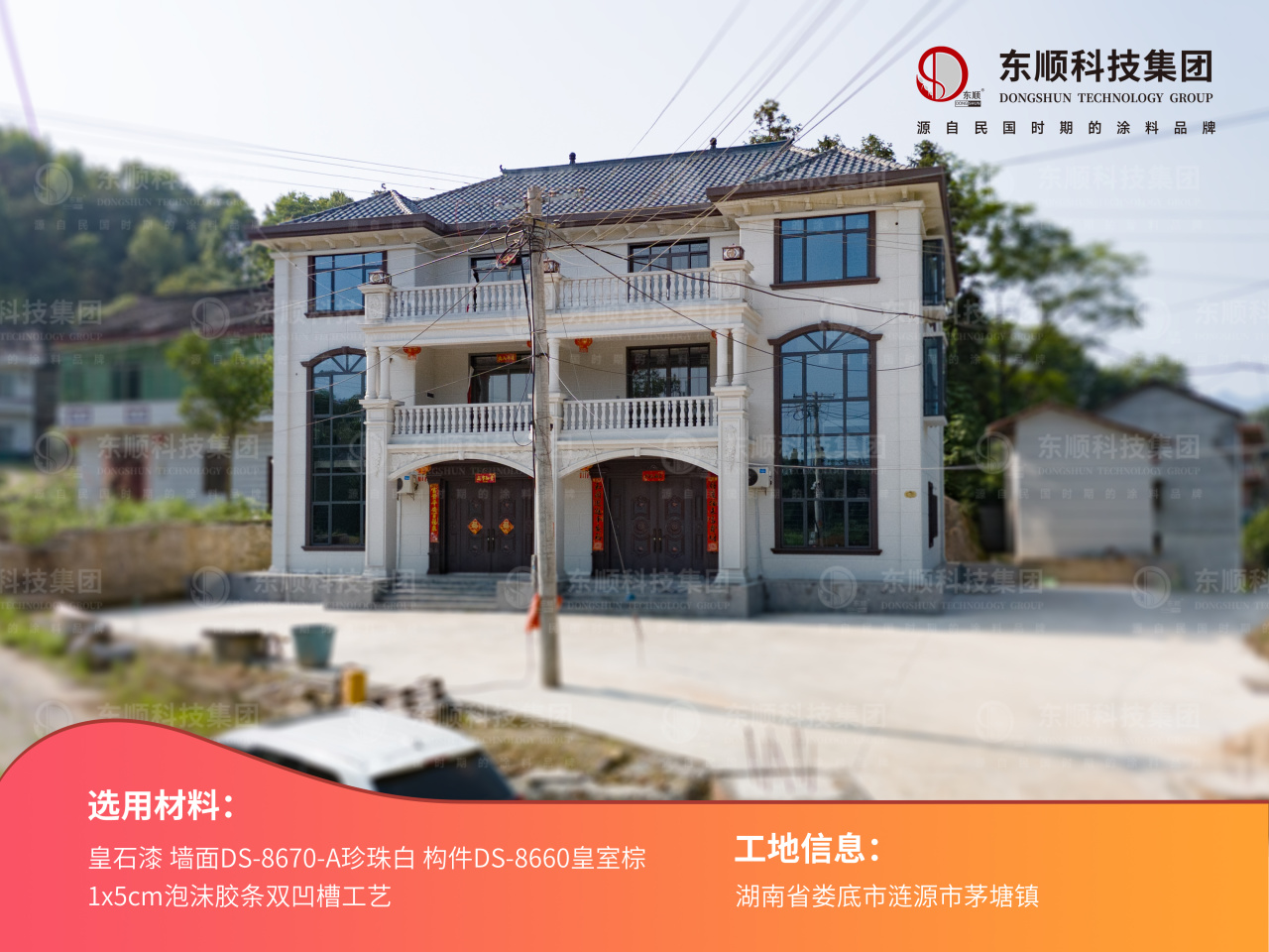 湖南省娄底市涟源市茅塘镇 皇石漆别墅案例 色号:墙面 DS-8670-A珍珠白 构件 DS-8660 皇室棕 泡沫胶条双凹槽工艺